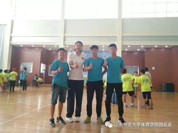 夏令营健康形象大使,中国国家女子排球队运动员,奥运会女排冠军杨方旭与山师体院员工对孩子的生活状况、活动内容进行了交流。对山师体院员工严谨、细致的工作态度表示肯定,为他们对孩子辛勤付出表示感谢,并合影留念。